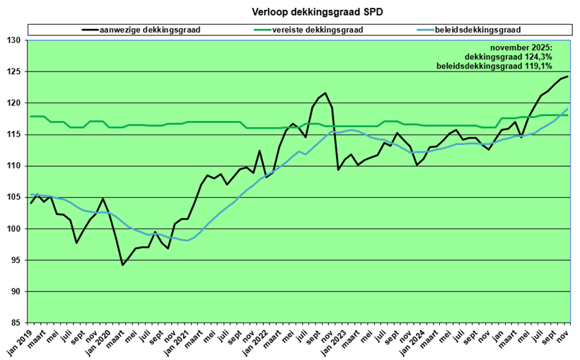 De actuele dekkingsgraad steeg in november 2025 van 123,9% naar 124,3%. De beleidsdekkingsgraad per eind november 2025 steeg naar 119,1%. Deze was eind oktober 2025 118,1%.